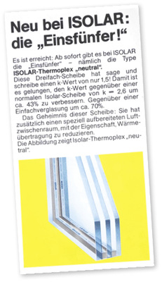 Im Zuge der 1. Wärmeschutzverordnung wurden Isoliergläser weiter optimiert. So waren bei Isolar bereits in der zweiten Hälfte der 70er-Jahre 3-fach-Gläser im Angebot.