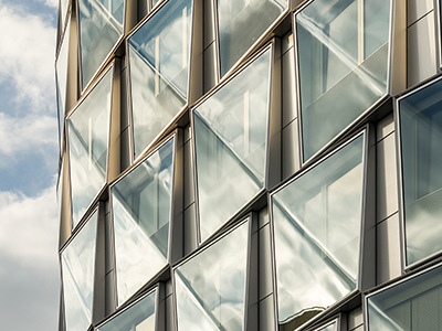 Im Pariser Vorort Boulogne-Billancourt verleihen Vorhangelemente mit diagonal gebogenen Scheiben der ungewöhnlichen Fassadenkonstruktion ihr lebendiges Erscheinungsbild. Entstanden ist ein „funkelndes Juwel“ mit unterschiedlichen Spiegelungen.