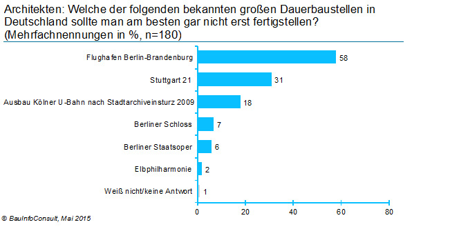 Bauen kann so schön sein, doch im Hightech-Wunderland Deutschland scheinen Großprojekte gerne mal aus dem Ruder zu laufen. In einer Umfrage äußern sich Architekten zu problematischen Großprojekten und jeder Zweite empfiehlt, den BER-Flughafen gar nicht erst fertig zu bauen. Auch Stuttgart 21 wird von den Architekten sehr kritisch beurteilt.