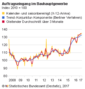 Um knapp 1 %t lag laut Statistischem Bundesamt der saison-, arbeitstäglich- und preisbereinigte Auftragseingang im Bauhauptgewerbe im April 2017 gegenüber dem Vormonat. Im weniger schwankungsanfälligen Dreimonatsvergleich stieg das Volumen von Februar bis April 2017 gegenüber dem Zeitraum November 2016 bis Januar 2017 sogar um 1,6 %.