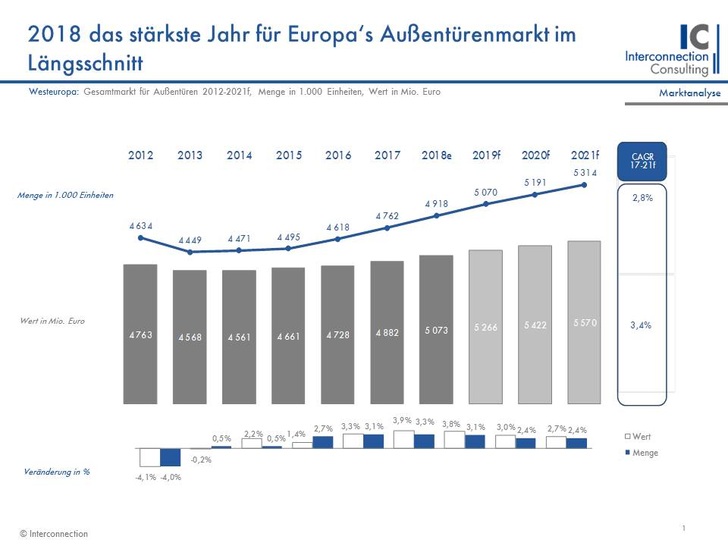 2018 wird der Markt für Außentüren in Westeuropa so stark wachsen, wie schon lange nicht mehr. Mit einem Plus von fast 4 % in Wert erreicht das Wachstum 2017/18 dann aber auch seinen Zenit für die nächsten Jahre.