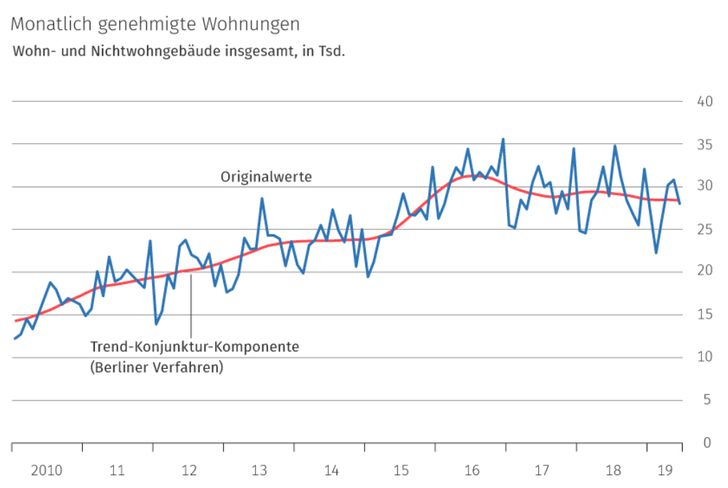 In neu zu errichtenden Wohngebäuden wurden von Januar bis Juni 2019 rund 142.400 Wohnungen genehmigt. Dies waren 3,1 % oder 4500 Wohnungen weniger als im entsprechenden Vorjahreszeitraum.