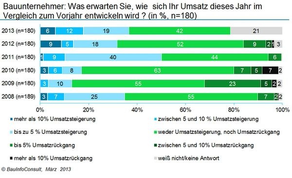 In der Umfrage zur Bau-Marktstudie Jahresanalyse 2013/2014 von BauInfoConsult wurden 180 Bauunternehmer im Februar 2013 zu ihren aktuellen Umsatzerwartungen befragt.