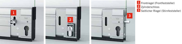 Das 3-in-1-Multilock-Bauteil bietet drei Möglichkeiten zur sicheren Verriegelung: den Frontriegel, den seitlichen Riegel und das Zylinderschloss.