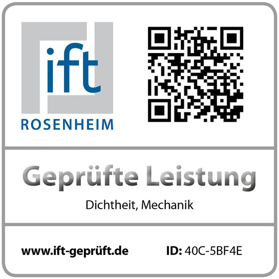 Das „ift-geprüft“-Zeichen ist ein geschütztes Warenzeichen und „Echtheitsindikator“ mit QR-Code und ID-Nummer, das einfach auf die herstellerunabhängige Website „www.ift-geprueft.de“ führt. Hier sind die zugehörigen ift-Nachweise für das geprüfte Produkt mit Infos zu technischen Kennwerten/Produkteigenschaften, Verwendung sowie geltenden Normen und Prüfkriterien verfügbar.