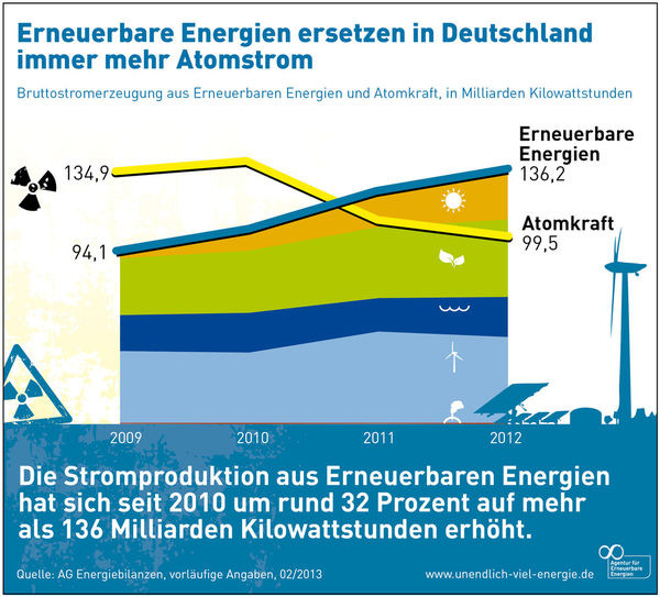 Das verlässliche Wachstum Erneuerbarer Energien und eine verbesserte Energieeffizienz ermöglichten nach Auskunft der AEE den Atomausstieg in Deutschland. So hat die Stromproduktion aus Wind, Sonne, Biomasse und Co. 2012 im Vergleich zu 2010 um rund 32 Prozent auf mehr als 136 Milliarden Kilowattstunden (Mrd. kWh) zugelegt. Deutschlands Bruttostromverbrauch sank in diesem Zeitraum laut Daten der AG Energiebilanzen um knapp 3 Prozent auf 595 Mrd. kWh. Dies konnte insgesamt den Rückgang bei der Kernkraft um knapp 30 Prozent auf 99,5 Mrd. kWh mehr als ausgleichen.