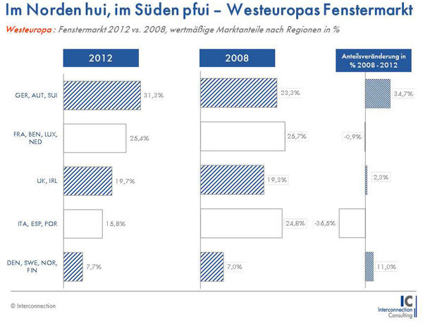 In Westeuropa – d.h. alle Länder westlich der Grenze Deutschland-Österreich-Italien inklusive Skandinavien – werden 2012 Fenster im Wert von 17,3 Mrd. Euro verkauft (2011: 17,8 Mrd. Euro). Dies entspricht einem Umsatzrückgang von 3,0%. Auch die Stückzahlen der abgesetzten Fenster entwickeln sich seit Jahren rückläufig: Wurden 2008 noch 74,9 Mio. Fenstereinheiten abgesetzt, so waren es im Jahr 2012 nur noch 60,2 Mio. Fenster. Im Schnitt ist der Markt um 5,3% pro Jahr geschrumpft .