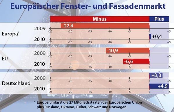 Nach einem starken Einbruch in 2009 hat sich der europäische Markt für Fenster und Fassaden im letzten Jahr stabilisiert. Er wuchs 2010 um 0,4 % auf 125,8 Mio. Fenstereinheiten. Das leichte Wachstum des europäischen Marktes um 0,4 % in 2010 ist auf die Markterholung in Russland und der Ukraine zurückzuführen. Nach einem tiefen Einbruch um 49,4 % in 2009 wuchs der Markt beider Länder im letzten Jahr um 21,4 %. Im Unterschied zum gesamten europäischen Markt ist der Absatz von Fenster- und Fassaden in den 27 EU-Staaten dagegen 2010 um 6,6 % und 2009 um 10,9 % gesunken. Allerdings ist die Entwicklung innerhalb der EU von großen Unterschieden geprägt.