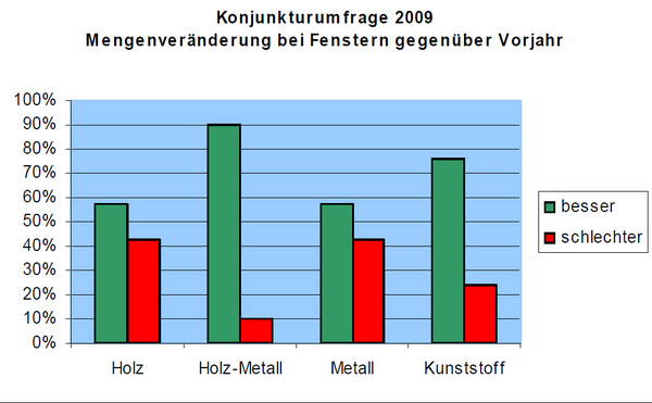 Gut entwickelt hat sich der Fenstersektor. Beim Rahmenmaterial Holz beurteilen 53 % die Lage als besser, bei Holz-Metall rund 60 %, bei Metall 41 % und bei Kunststoff 73 %. „Hier wirkt sich das Konjunkturpaket II positiv aus. Insgesamt betrachtet wird wieder mehr in den öffentlichen Sektor investiert. Benachteiligt ist allerdings der Metallbereich“, so Tschorn. Haustüren entwickeln sich ebenfalls positiv: Rund 33 % der Hersteller melden bessere Umsätze, bei Holz-Metall-Türen beurteilen 36 % die Lage als besser, bei Metall sind die Umsätze bei 38 % der Unternehmen gestiegen und im Bereich Kunststofftüren bei 58 %.