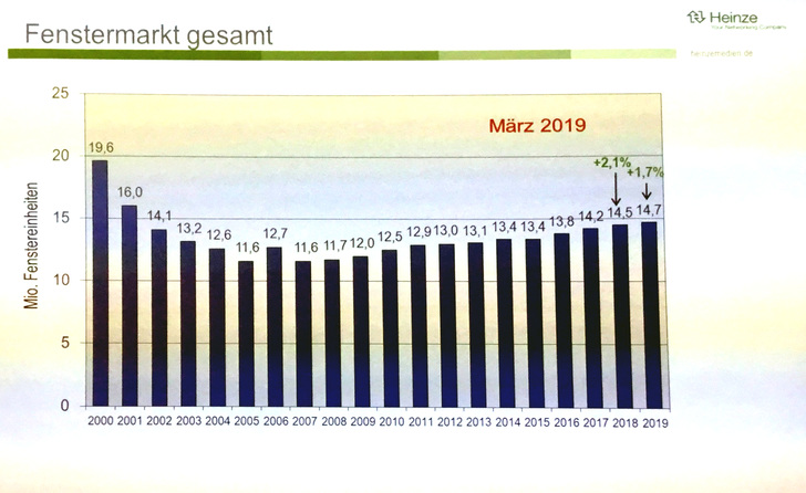 Erstmals aber konnten 2018 die Produktionszahlen in Deutschland wieder – wenn auch in sehr geringen Umfang – zulegen auf 12 Mio. Fenstereinheiten (+ 0,4 %). Importiert wurden 2018 über 3,7 Mio. Fenstereinheiten – was bei einem Gesamtabsatzmarkt von 14,5 Mio. Fenstereinheiten einen Anteil von über 25 Prozent ausmacht.