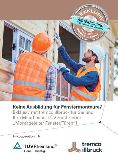 Noch besser für den anspruchsvollen Alltag gerüstet sind ab sofort alle Fenstermonteure mit der neuen von der TÜV Rheinland und tremco illbruck initiierten Weiterbildung zum „Montageleiter Fenster/Türen“. Das Weiterbildungskonzept wurde zusammen mit der TÜV Rheinland entwickelt und bietet den Abschluss „PersCert TÜV“. Dieser Abschluss stehe für geschultes Personal, getestet und zertifiziert durch eine neutrale Prüfstelle.
