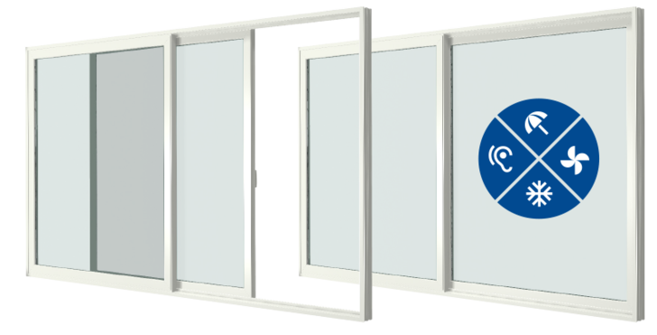 Für die Festteile gibt es zwei Alternativen: Es kann zwischen einer symmetrischen Ansicht im Gesamtelement oder einer bewusst asymmetrischen Gesamtansicht, die mehr Glasfläche bietet, gewählt werden. Zur farblichen Gestaltung stehen neben der klassisch weißen Profilausführung zahlreiche Dekorfolien in Uni- und Metallicfarben sowie mit Holzstrukturen zur Verfügung.