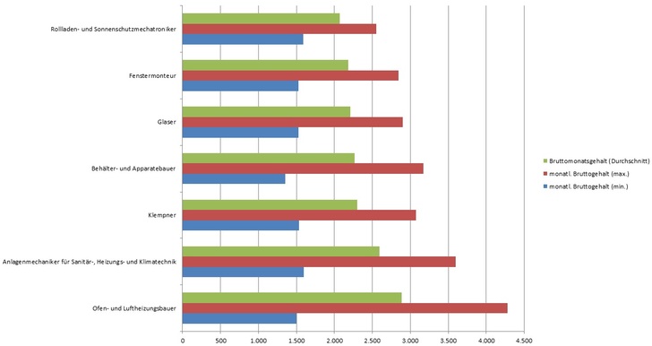 Für einen Überblick über die Gehälter der unterschiedlichen Berufsgruppen im Handwerk lohnt sich der Blick auf das Gehaltsportal Gehaltsvergleich.com . Die Ergebnisse der durchschnittlichen Bruttomonatsgehälter für folgende Berufsgruppen aus der Gebäude- und Fassadentechnik zeigen sich wie folgt: