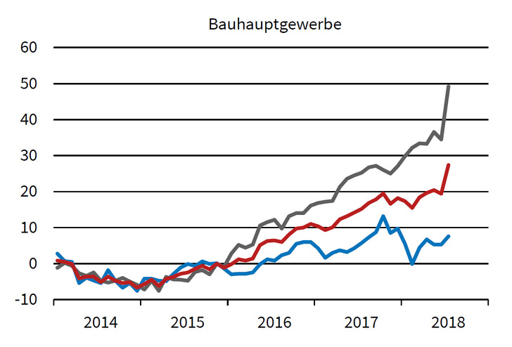 Im Bauhauptgewerbe hat allerdings der Geschäftsklimaindex ein neues Rekordhoch erreicht. Der Anstieg ist der stärkste jemals beobachtete. Gleiches gilt für den Lageindikator, der deutlich nach oben korrigiert wurde. Auch die Erwartungen sind optimistischer ausgefallen. Das Bauhauptgewerbe befindet sich im Boom.