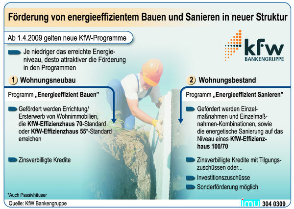 Zum 01.04.2009 wird die Förderung zur Verbesserung der Energieeffizienz von Wohngebäuden bei der KfW Bankengruppe neu strukturiert. Grundlegend für die neue Förderstruktur ist die Ausrichtung an der Energieeffizienz. Je niedriger das Energieniveau nach Abschluss der Maßnahme, desto günstiger die Konditionen in den Programmen.