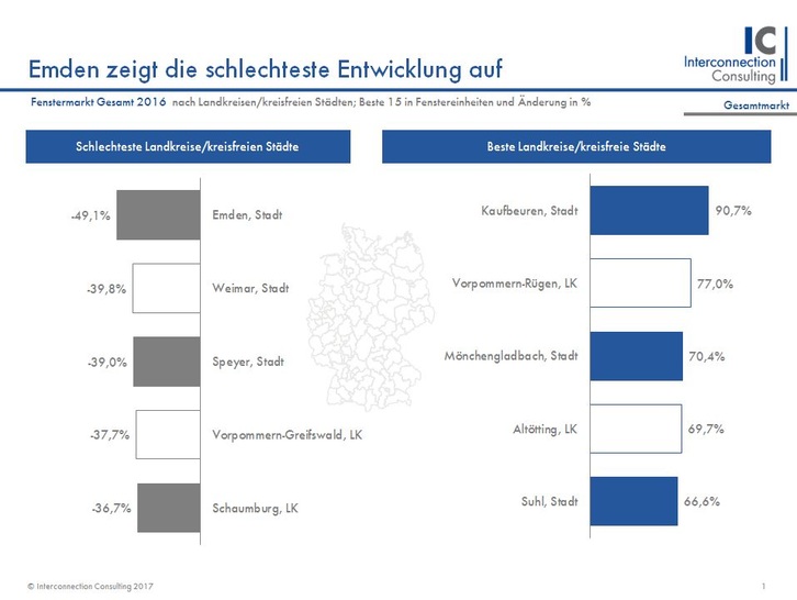 Das Wachstum am deutschen Fenstermarkt ist in den einzelnen Regionen sehr unterschiedlich und reicht von +15,5% in Berlin bis -7,0% in Thüringen. Der gesamte Fenstermarkt wuchs im Jahr 2016 um 4,7%. Die Flüchtlingskrise wird aufgrund des gestiegenen Bedarfs an Wohnraum zum mittelfristigen Wachstum am Fenstermarkt weiterhin beitragen, wie die neue Regionalmarktstudie Win!Local von Interconnection Consulting zeigt.