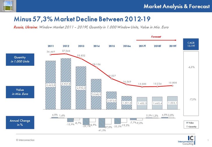 Im Jahr 2015 ist der durch Fenster erwirtschaftete Umsatz in den Märkten Russland und Ukraine um über 40% auf 2,07 Mrd. Euro eingebrochen. Die wirtschaftspolitische Situation in beiden Ländern resultiert zum dritten Mal in Folge in einem zweistelligen Marktrückgang. Auch im vorliegenden Jahr wird der Markt laut Interconnection Consulting noch einmal um 25,3% in Wert einbrechen.