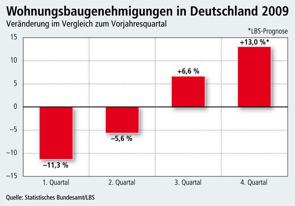 Nach jahrelangen Rückgängen im deutschen Wohnungsbau gibt es jetzt Erholungstendenzen. Laut Prognose der Landesbausparkassen (LBS) werden die Baugenehmigungen im 4. Quartal 2009 und im Jahr 2010 zweistellige Wachstumsraten erzielen.