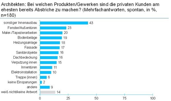 40 Prozent der Architekten gaben an, dass die Kunden eher im Bereich des Innenausbaus den Rotstift ansetzten werden. Weiter schätzen ein Fünftel der Architekten, dass der Kunde bei den Fenstern und Außentüren, den Maler- und Tapezierarbeiten sowie den Bodenbelägen sich eher nach günstigeren Varianten umschauen wird.