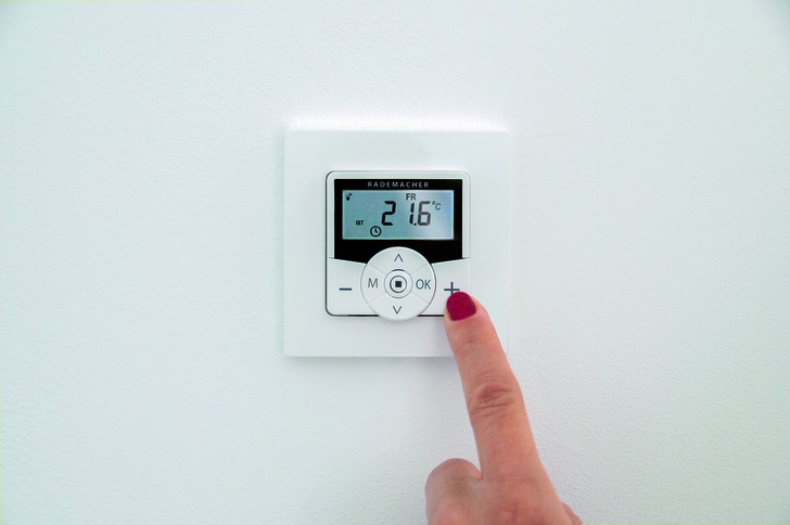 Das Raum-thermostat für HomePilot ermöglicht eine individuelle Einzelraumregelung der Heizung nicht nur von Elektroheizkörpern, sondern auch von Fußbodenheizungen. Mit dem Raum-Thermostat können bis zu sechs Schaltzeitpunkte und vier individuelle Soll-Temperaturen täglich hinterlegt werden, so dass Heizkörper und Fußbodenheizung immer nur dann laufen, wenn sie wirklich benötigt werden. Gleichzeitig sorgt das Raumthermostat zuverlässig für Frostschutz. Sinkt die Temperatur in nur wenig beheizten Räumen oder bei längerer Abwesenheit unter den kritischen Wert, fährt die Heizung automatisch hoch. Besonders praktisch ist das Raumthermostat auch für den Einsatz in Wintergärten: Wird eine bestimmte Temperatur über das Thermostat erfasst und an den HomePilot gesendet, löst das eine voreingestellte Szene aus. Zum Beispiel fahren dann die Raffstoren automatisch herunter, damit sich ein dämmendes Luftpolster zwischen Raffstore und Fensterglas bildet, das Energieverluste reduziert.
