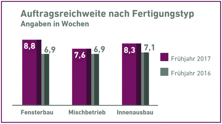 Die Fensterbaubetriebe verzeichnen gegenüber dem Vorjahr die größte Steigerung. Hier liegt die Auftragsreichweite mit nun 8,8 Wochen um ca. zwei Wochen höher als vor einem Jahr. Die Innenausbaubetriebe melden eine Auftragsreichweite von 8,3 Wochen und die Mischbetriebe von 7,6 Wochen.
