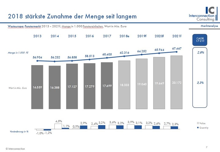 Der Markt für Fenster in Westeuropa wird in diesem Jahr um 3,6% ansteigen. Bis 2021 wird ein durchschnittliches Wachstum für die Branche von 3,3% prognostiziert, wie eine Studie von Interconnection Consulting zeigt. Für den deutschen Fenstermarkt sagt man 2018 ein Plus von 5,4% voraus.