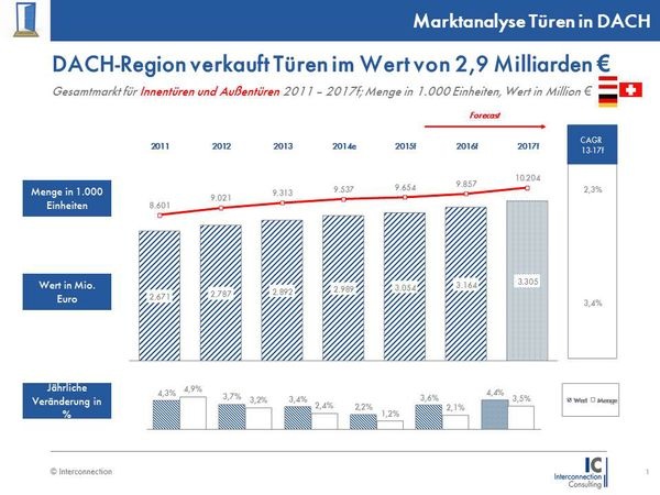 Der Türenmarkt in Deutschland, Österreich und der Schweiz ist 2,9 Mrd. Euro schwer. Gegenüber dem Jahr 2013 wuchs der Markt heuer um 2,4% in Menge und 3,4% in Wert.