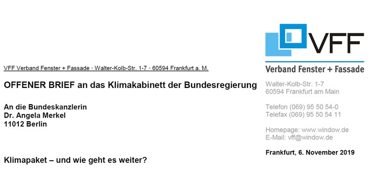 In einem offenen Brief an das Klimakabinett der Bundesregierung hat der Verband Fenster + Fassade (VFF) am 6. November 2019 die jetzt vom Kabinett verabschiedete steuerliche Förderung energetischer Gebäudesanierung begrüßt, zugleich aber auch eine entsprechende Förderung im gewerblichen Wohnungsbau angemahnt.