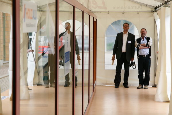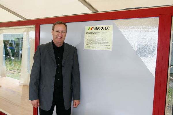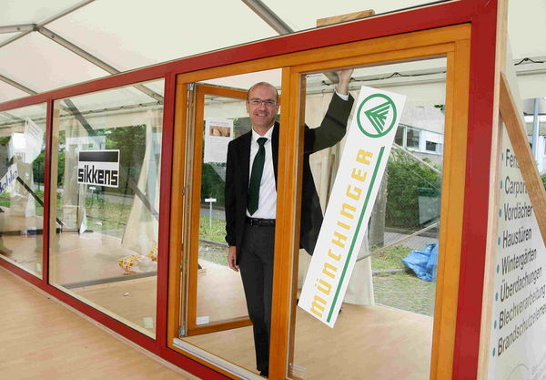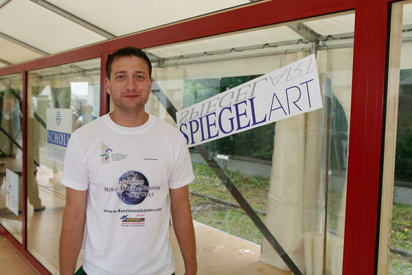 Auch die Firma aluplast unterstützte die Aktion und legte sogar noch einen drauf: Auf dem Gelände der Akademie wurde zugleich das größte Kunststofffenster der Welt aufgebaut: Ganze 18m waren die extrudierten PVC-Profile lang. Das ergab eine Fensterfläche von rund 40m². Auf dem Bild: Geschäftsführer Patrik Seitz vor dem größten Dreh-Kipp-Fenster.