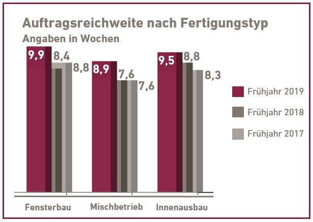 Bei den Auftragsreichweiten der Innenausbau-, der Fensterbau- und der Mischbetriebe ist eine spürbare Steigerung gegenüber dem Vorjahr festzustellen. Die Fensterbaubetriebe melden mit 9,9 Wochen wieder die größte Auftragsreichweite (Vorjahr 8,4 Wochen). Aber auch die Innenausbauunternehmen verzeichnen sehr gute 9,5 Wochen.