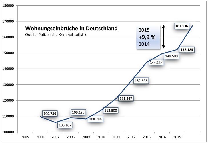 Die bundesweite Polizeiliche Kriminalstatistik (PKS) für das Jahr 2015 werde wohl erst im Mai von Thomas de Maiziere veröffentlicht, der Tageszeitung "Die Welt" liegen aber wohl schon die Papiere vor. Demnach wurde beim Wohnungseinbruchdiebstahl mit 167.136 Fällen ein Rekordwert registriert. Das ist eine deutliche Zunahme um 9,9 % im Vergleich zu 2014.