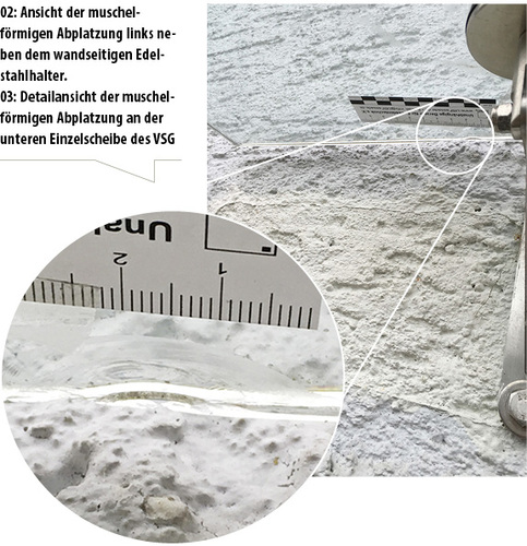 - Die untere Einzelscheibe des Verbundsicherheitsglases hat an der wandseitigen Glaskante links vom linken Edelstahlhalter eine ca. 3 cm breite muschelförmige Abplatzung (Bilder 02 und 03).