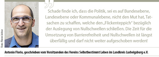 Wir haben dazu Ulrike Jocham, Heilerziehungspflegerin und Dipl.-Ing. Architektur sowie Bausachverständige für Schäden an Gebäuden (DESAG), Barrierefreiheit, Universal Design und Inklusion befragt. Sie kennt die verschiedensten Behinderungsformen und untersucht bereits seit über 13 Jahren disziplinübergreifend die Technik von Nullschwellen. Sie ist als Bausachverständige, Seminarleiterin, Referentin, Autorin und Beraterin ( www.die-frau-nullschwelle.de ) tätig.