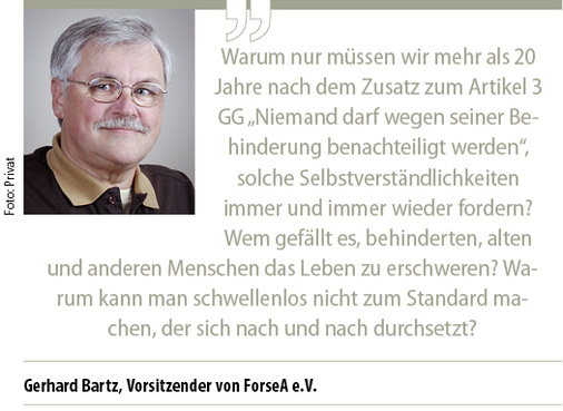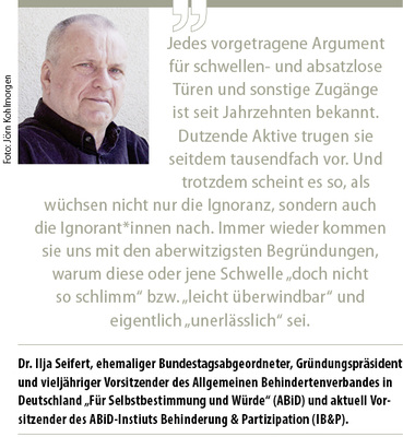 Jocham – Diesbezüglich ist das ift mucksmäuschenstill. Auch bei sonstigen öffentlichkeitswirksamen Aktivitäten hinsichtlich Barrierefreiheit werde ich als „Frau Nullschwelle“ vom ift eher umgangen. Dabei fände ich eine fachliche und öffentliche Auseinandersetzung extrem spannend.
