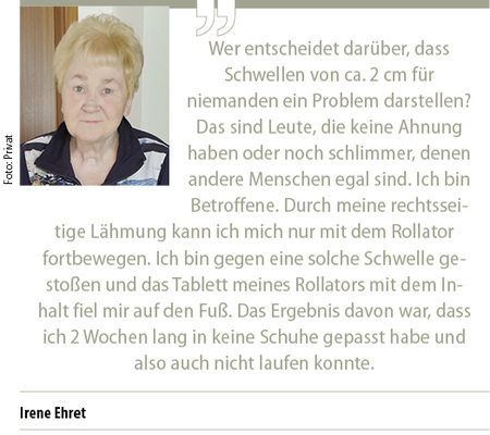 Jocham – Dass die Nullschwelle im Neubau gut umsetzbar sei, hat der ift-Institutsleiter Sieberath erst vor Kurzem gesagt, nachdem ich zahlreiche widerlegende Argumente bezüglich des ift-Forschungsberichtes aus 2018 an das ift und an das BBSR als Fördergeldgeber gesendet habe. Ich freue mich über diese sehr positive Entwicklung. Doch nun sind Korrekturen im Forschungsbericht gefordert. Allein die Zusammenfassung darin widerspricht den Aussagen von Sieberath. Und wenn das ift nun die Sanierung bezüglich der „Überrollbarkeit“ meinen möchte, dann müssen im Forschungsbericht Schwellenabbauten im Bestand untersucht werden. Nullschwellen im Neubau können ganz einfach umgesetzt werden, in der Sanierung sind die Rahmenbedingungen wesentlich komplexer – doch es ist kein einzig untersuchter Rückbau im Bestand im Forschungsbericht zu finden!