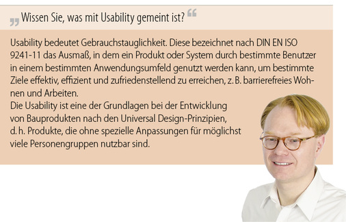 _ Wichtig ist, dass Handwerker und Planer eine wirklichkeitsnahe Auffassung von Barrierefreiheit haben: Das bedeutet, der Nutzer muss immer im Mittelpunkt der baulichen Maßnahmen stehen, d. h die Gebrauchstauglichkeit (Usability) für die jeweiligen Nutzer, egal ob alt oder jung, mit und ohne körperliche Beeinträchtigung, muss gegeben sein.