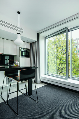 Harmonisches Zusammenspiel der Hotelfassade mit der sanierten Fassade des Spiegel-Verlagshauses.