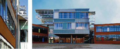 Die Vergabe der Gewerke Fenster/ Sonnenschutz, einschließlich der Nebenarbeiten erfolgte an den Fensterbaubetrieb Schmidt in Visbek. Der Verarbeiter hatte für die Konstruktion der Fensterbänder sein Holz-Alu-Profilsystem Typ ip-55s vorgeschlagen. Gerade für Fensterbänder bietet dieses innovative Bauelement interessante neue Gestaltungsmöglichkeiten. Es ist wirtschaftlich und eignete sich dank seiner ansprechenden Ausstattungsmerkmale und optimalen Fertigungsvorteile hervorragend für das neue Schulprojekt.
