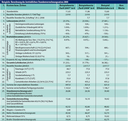 Mit den beschriebenen Vorgaben entsteht ein Stundenkostensatz von 42,66 Euro (anstelle 42,52 Euro) für einen Mitarbeiter, der nach Tarif in der Lohngruppe 5 bezahlt wird. Bei einem Aufschlag für Wagnis und Gewinn von 8 Prozent ergibt sich ein Stundensatz-Netto in Höhe von 46,07 Euro, das sich mit den 19 Prozent Mehrwertsteuer auf ein Brutto von 54,82 Euro (54,64) hochrechnet. Bei einem mit 13,60 Euro übertariflich bezahlten Mitarbeiter beträgt der Brutto-Stundenverrechnungssatz 62,75 Euro und ist damit zu 2007 um 0,6 % angestiegen.