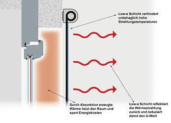 „Beim OptiSystem 01 montiert Warema das innen liegende Blendschutzrollo mit der schwarzen Seite zum Fenster. Damit zeigt die hochreflektierende und aluminiumbedampfte Seite ins Rauminnere und fungiert als Flächenheizung“, erläutert Ulrich Lang von Warema. Das ideale Produkt soll ein dunkles Blendschutzrollo sein, dessen Behang nicht nur eine geringe Transmission aufweist, sondern dessen schwarze Fläche zugleich als Absorber wirkt. Das Fenster wird so zum Energieerzeuger. „Jeder Sonnenschutzfachmann wird dabei zunächst stutzig“, so Lang, „denn bisher galt doch der Grundsatz, dass die hochreflektierende Seite des Stoffes zum Fenster zeigen muss, damit die durch die Verglasung einfallende Strahlung wieder nach außen reflektiert wird". Bei normaler Betrachtung kann nur so mit einem innen liegenden Sonnenschutz eine Überhitzung vermieden werden. „Das gilt aber nur für den Fall, dass kein außen liegender Sonnenschutz vorhanden ist und der Schutz vor Überhitzung mit dem innen liegenden Produkt erreicht werden muss“, so Lang. Deshalb sollte wann immer möglich die Funktion des Hitzeschutzes von einem außen liegenden Produkt realisiert werden. „Die erreichbaren Fc-Werte sind bei innen liegenden Produkten immer schlechter als bei außen liegenden Lösungen“, erklärt Lang und folgert, dass der Schutz vor Überhitzung nicht die Kernaufgabe des innen liegenden Sonnenschutzes sein kann.