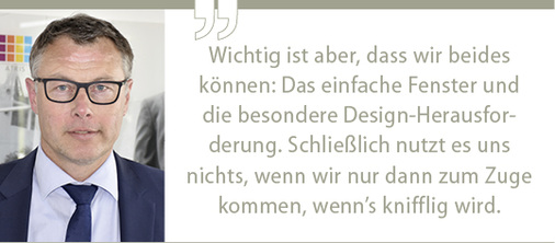 Das Designthema stellt uns aber auch vor große Herausforderungen – schließlich liefern wir in 27 Länder. Italien beispielsweise ist sehr farbverliebt. Aber auch solche Themen wie die Gestellfrage muss für jedes Land geklärt werden. Wir haben viel Erfahrung in der Logistik, wissen aber auch, dass wir es nicht allen Kunden im Ausland recht machen können. Wichtig ist aber, dass wir beides können: Das einfache Fenster und die besondere Design-Herausforderung. Schließlich nutzt es uns nichts, wenn der günstige polnische Anbieter das Standard-Weiß-Fenster liefert und wir nur dann zum Zuge kommen, wenn´s knifflig wird.