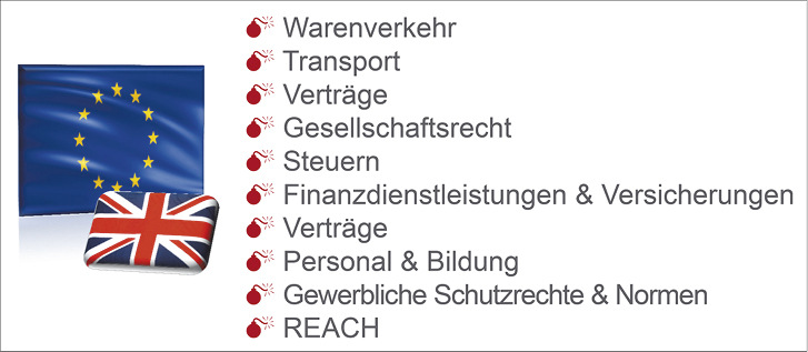 Die CEN-Regularien und Statuten verpflichten jedes nationale Normungsinstitut, europäische Normen unverändert als nationale Normen zu übernehmen und „abweichende nationale Normen“ zurückzuziehen. Allein dies sollte die Sicherheit geben, dass die in Europa ausgehandelten Normenkompromisse auch nach wie vor in Großbritannien breite Anwendung finden werden. Dabei trifft es nicht nur den Warenverkehr; die Verflechtungen sind vielfältig, was auch der Blick in die Brexit-Checkliste der IHK ( www.ihk.de/brexitcheck ) bestätigt (Bild 1).