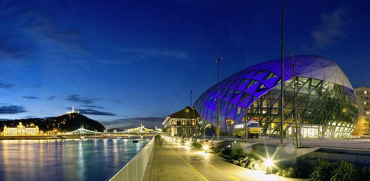 _ Der außergewöhnliche Entwurf des niederländischen Architekturbüros Kas Oosterhuis aus Rotterdam, bindet denkmalgeschützte Lagerhallen von 1881 in eine rund 150 m lange Konstruktion aus Stahl und Glas ein. Es ist jedoch auch diese Mischung aus alt und neu, die dem Gebäude seinen besonderen Charakter verleiht. Die gläserne Außenhülle überspannt eine Gesamtfläche von über 26 000 m2, die sich auf das Erdgeschoss, vier oberirdische und drei unterirdische Etagen verteilen.