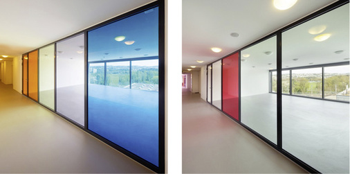 Schaltbare Gläser: Auf der Swissbau wurde auch SageGlass vorgeführt. Mit diesem elektronisch tönbaren, elektrochromen Glas lässt sich Sonnenlicht und Hitzeeinstrahlung per Knopfdruck oder automatisch steuern. Bei starker Sonneneinstrahlung und maximaler Tönung durchdringe nur knapp ein Prozent des Lichtes das schaltbare Glas. Das Bild oben links zeigt eine blau getönte Scheibe, die rechts im ungeschalteten transparentem Zustand ist. Die elektrochromen Gläser sind stufenlos regulierbar und ermöglichen so bei jedem Wetter ein angenehmes Raumklima.
