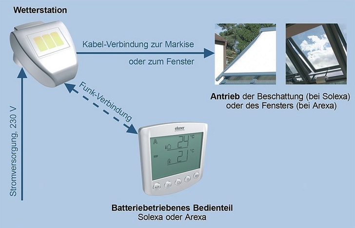 Die Beschattungssteuerung „Solexa“ fährt den Sonnenschutz abhängig von Helligkeit und Raumtemperatur aus und wieder ein. Es kann eine Außen- oder Innenmarkise oder eine Jalousie gesteuert werden, denn die Sicherheitsfunktionen Regen-, Wind- und Frostschutz sind einzeln deaktivierbar. Die Fenstersteuerung „Arexa“ öffnet und schließt ein Fenster abhängig von der aktuellen Raum- und Außentemperatur. Bei Regen oder Wind kann das Fenster zum Schutz der Einrichtung automatisch geschlossen werden. Herzstück der Steuerungen ist die Wetterstation, die Außentemperatur, Helligkeit, Niederschlag und Windgeschwindigkeit erfasst. Der zu steuernde Antrieb wird direkt an der Sensoreinheit angeschlossen, was den Verkabelungs-Aufwand minimiert. Mehrere gleichartige Antriebe können über ein Gruppensteuerrelais angesteuert werden. Die Wetterstation und das batteriebetriebene Bedienteil tauschen ihre Daten und Befehle per Funk aus.