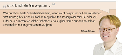 Diese Klassifizierung wird zunehmend bei Verglasungen von Paniktüren gefordert, die mit einem Bügelgriff zu öffnen sind.