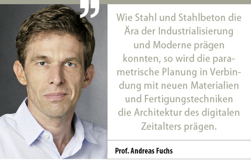 Prof. Fuchs – Mein Wunsch ist es Technologien zu entwickeln, die mehr Freiheiten für den Planer und die Architektur bieten. Wie Stahl und Stahlbeton die Ära der Industrialisierung und Moderne prägen konnten, so wird die parametrische Planung in Verbindung mit neuen Materialien und Fertigungstechniken die Architektur des digitalen Zeitalters prägen. Aus welchem Grund sollen wir uns auf 90°, ebene Flächen und wiederholende Elemente beschränken? Dies steht keineswegs einer ambitionierten Farbgestaltung entgegen. Wenn Sie sich beispielsweise das Projekt KFW Westarkade von Sauerbruch Hutton anschauen, haben wir hier ein gelungenes Beispiel für komplexe Geometrie, abwechslungsreiche Farbgestaltung und dynamische Architektur. Aus meiner Sicht muss Architektur und die damit verbundene Industrie mehr bieten als einen nostalgischen Blick zurück in die Vergangenheit.—