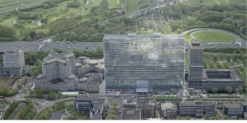 _ Die Skyline von Rijswijk im Osten von Den Haag wird nun von einer 156 m langen, 107 m hohen und nur 24,7 m tiefen Scheibe aus einem Stahltragwerk und Glas geprägt, dem Büroturm des EPA-Komplexes. Hier arbeiten rund 2900 EPA-Mitarbeiter. Eingesetzt wurden an den Fassaden des neuen EPA-Dienstgebäudes insgesamt 100 000 m2 Glas.