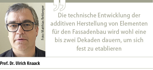 Wie bei allen additiven Herstellungstechnologien ist die Materialqualität ein wesentlicher Entwicklungsparameter – im Bereich Beton noch gepaart mit der Notwendigkeit, eine Zugbewehrung in die zu extrudierende Betonmasse einzubringen. Betonfassaden sind derzeit noch nicht im Fokus, ein Umstand, der sich aufgrund der Möglichkeiten sicherlich schnell ändern wird.