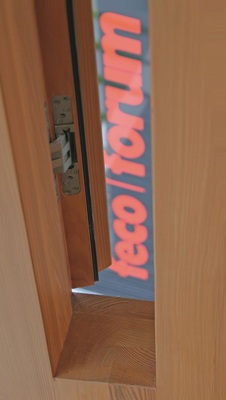 20 m³ ausgesuchtes Lärcheholz, wurde für die Ausstellungsfassade des feco-Forums verarbeitet. Der Fenster- und Fassadenbauer Schillinger erläuterte, dass die Rundholzklötze mit einer Länge von 7m eingekauft und eingeschnitten wurden. Die Höhe der Fassadenpfosten beträgt 6,75 m, die Pfosten sind 150 mm breit und 750 mm tief. Dabei bringt ein Pfosten ein Gewicht vom 450 kg auf die Waage. In die Fassadenpfosten sind Lüftungsklappen fast unsichtbar integriert. |